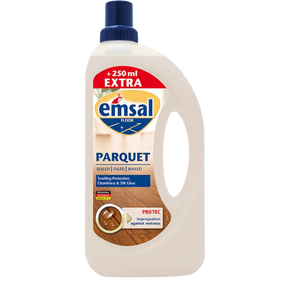 Care for the parquet floor with protection against damage. Emsal parquet formula provides optimal protection against swelling for all exposed joints and edges. Applicable to sealed parquet, oiled and waxed wooden floors and ideal for pre-finished wooden floors. Effective surface protection is provided by a special combination of active ingredients.