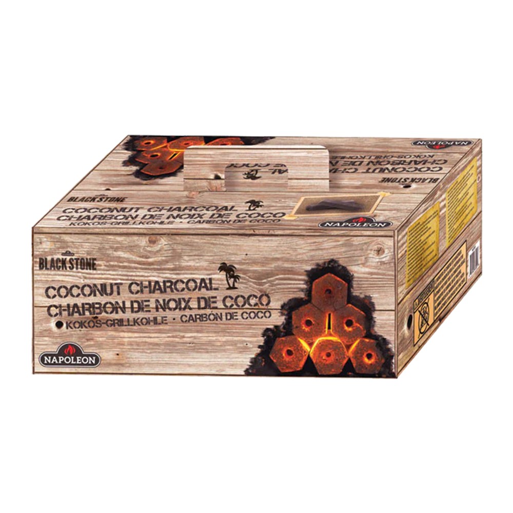 Napoleon black stone coconut briquettes are made from 100% natural coconut shells. When burning, they are smokeless, odorless, and flameless, adding more flavor to the food you will cook, but also making this process safer. These briquettes have a longer burn time than charcoal, as they have a burn time of around 6-8 hours, and also have less ash residue, which means less cleaning time for the barbecue. . A briquette measures approximately 6 cm, and is very efficient, as it has a high heat output.