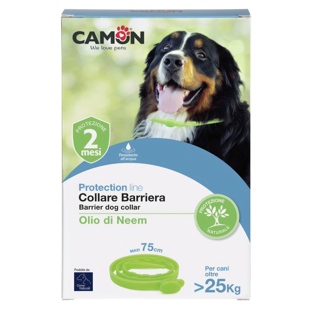 The barrier collar Orme Naturali keeps parasites and insects away from your dog. It is impregnated with Neem essential oil. It can be used alone or in combination with the lotion or the spot-on tubes. It is a natural product: safe for pets and for the environment. It is waterproof and guarantees a 2-months-long protection.Its recommanded to be used for dogs larger than 25 kg.