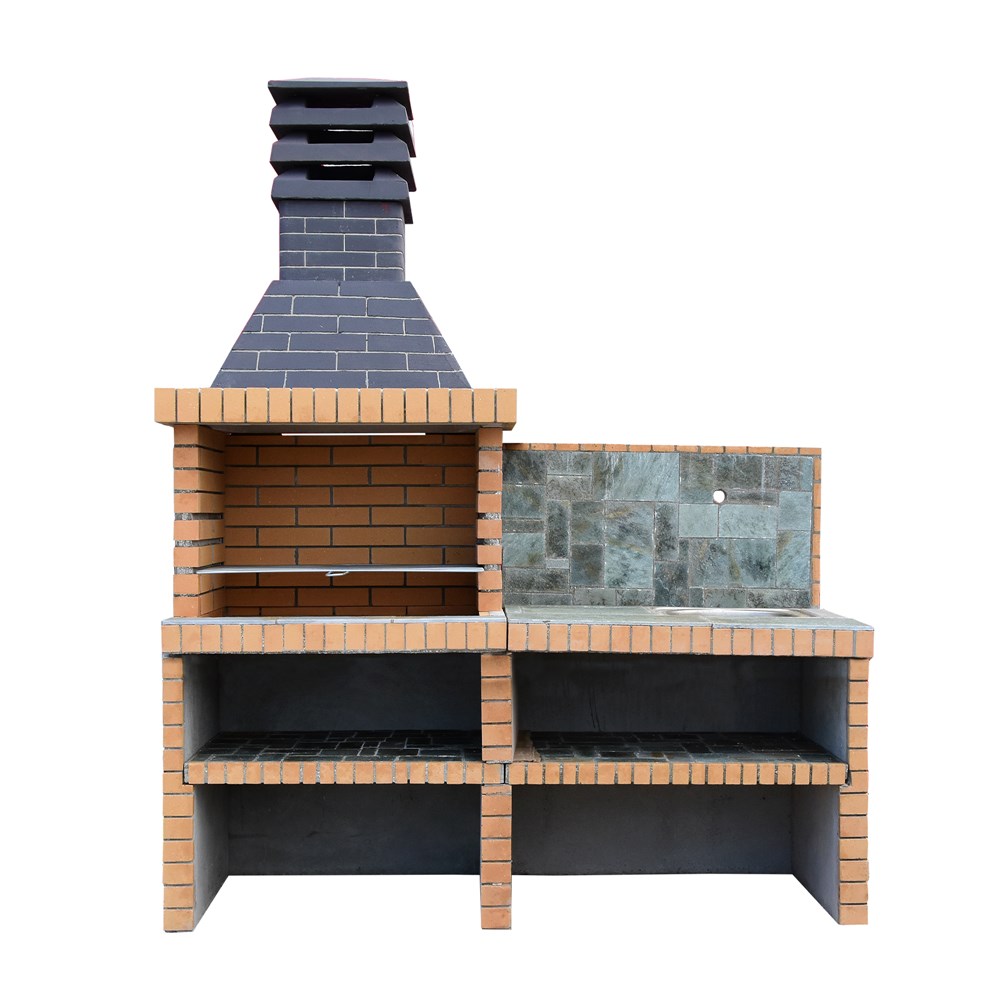 Made of concrete and treated with refractory solution. Equipped with height positions to place the baking tray. Designed with space for positioning various barbecue accessories and equipped with benches and sinks. Assembly required.