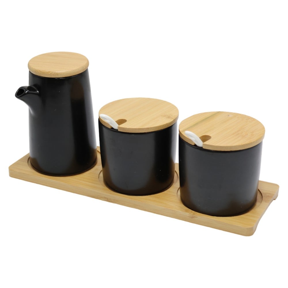 Set of three holders for spices and oil, made of ceramics and bamboo, in black and brown. Provides an appropriate choice for everyday organization in the kitchen.