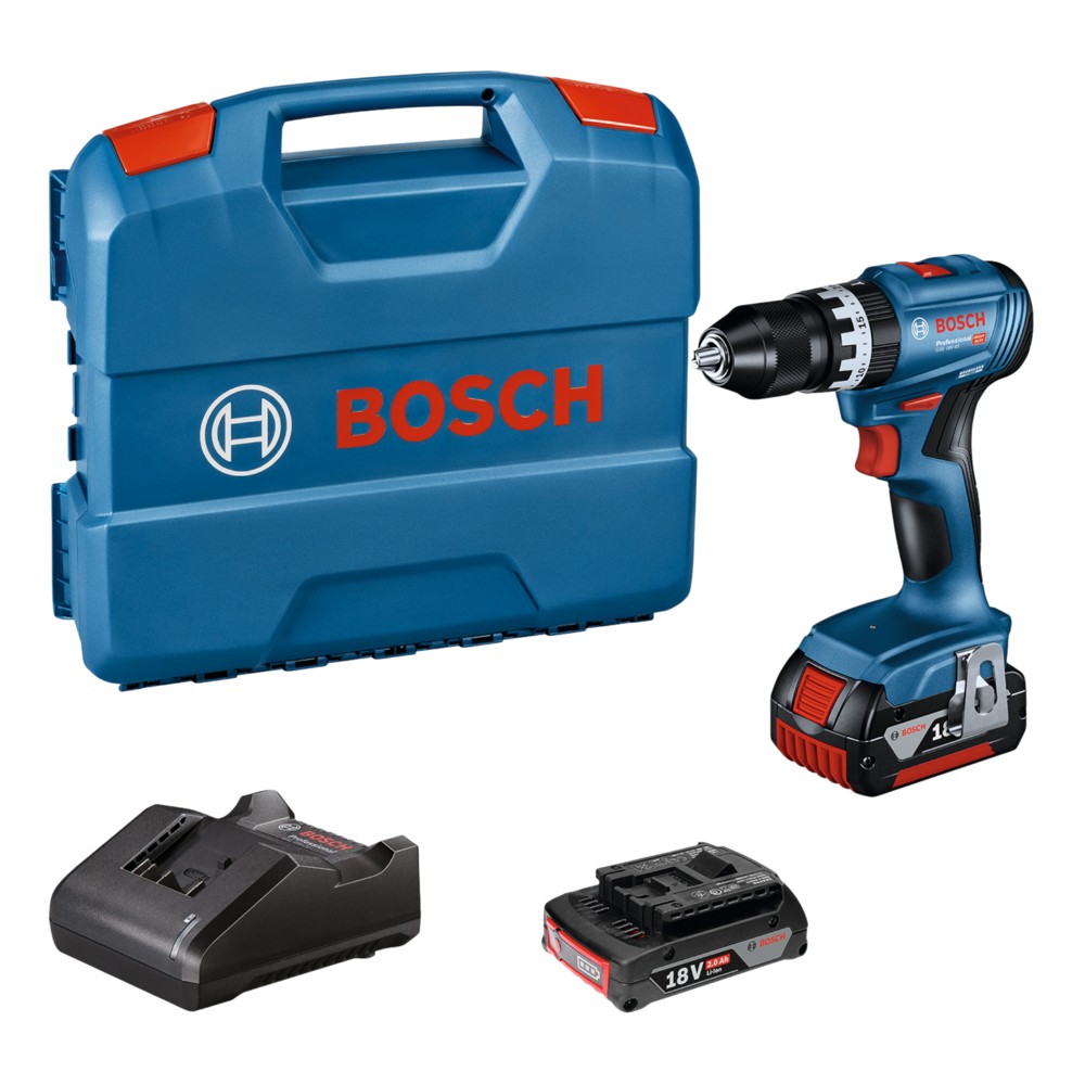 Cordless drill, Bosch, GSB 18V-45, 18 V, 2x2 Ah, 0-500/​0-1900 rpm, 21-45 Nm, drilling in metal 10 mm, drilling in concrete 10 mm, drilling in wood 35 mm (batteries included)