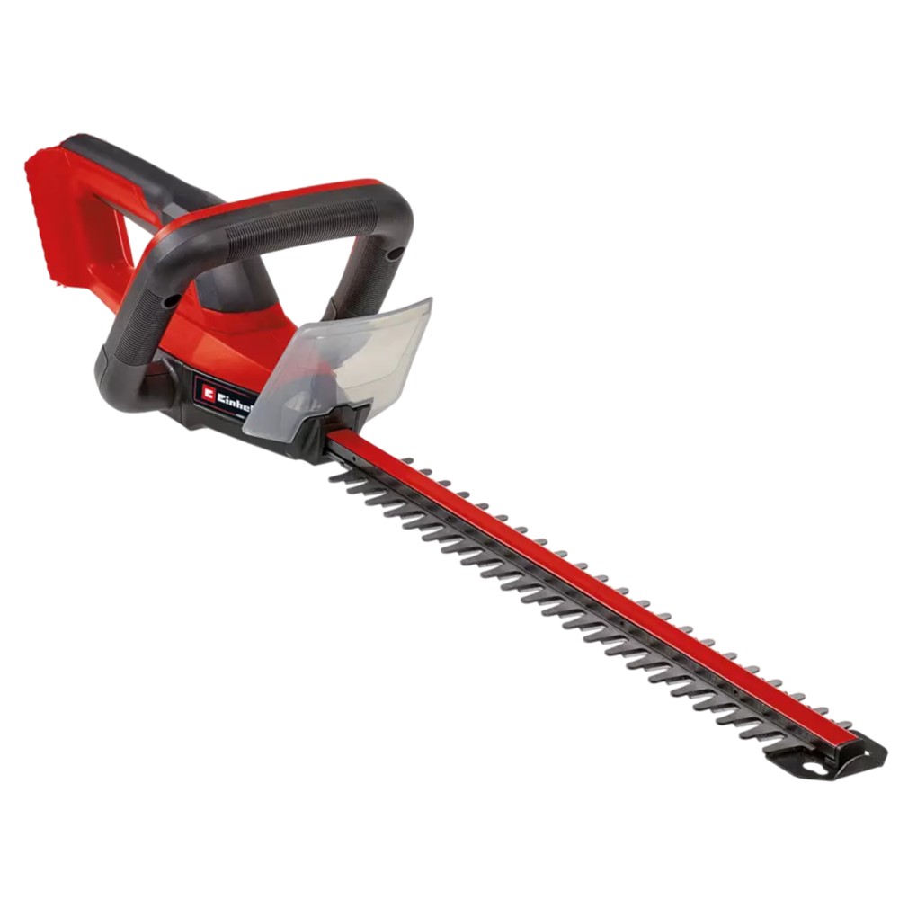 The Einhell cordless hedge trimmer GC-CH 18/40 Li Solo combines power and flexibility: As a member of the Einhell Power X-Change family, the hedge trimmer is powered by one of the series' powerful lithium-ion batteries. The small, handy hedge trimmer is a real ""lightweight"" and comfortable to use thanks to its low weight. The robust metal gearbox is designed for a long service life and ensures the perfect transfer of the battery-power to the laser-cut and diamond-ground steel blades. A 2-hand safety switch protects the user during operation. An aluminium blade cover to protect the blades as well as a shock protection with bracket for wall mounting and a sturdy case for storage and transport are included in delivery. The batteries from the high-quality Power X-Change series can be combined limitlessly with all system devices. 1x 18-volt battery is required for operation of the cordless hedge trimmer. Delivery does not include a battery or charger, but these are available separately, for example as a practical starter kit in various sizes.
