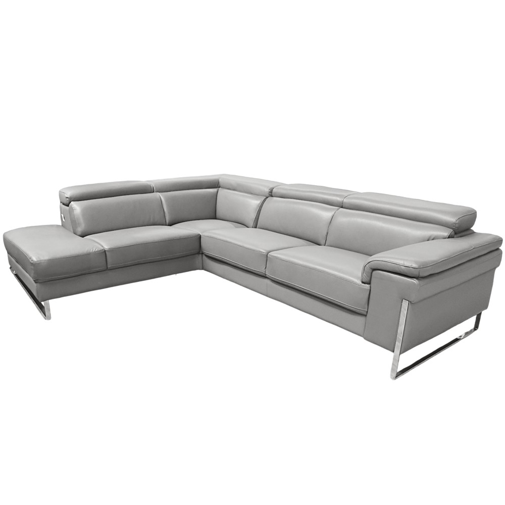 Corner sofa, with canape on the left side, with measurements of 188x337xH81(100) cm, with leather upholstery, in light gray color. The supporting structure is composed of durable wooden bars and melamine. The medium-soft inner padding consists of high-density foam materials and the outer structure is equipped with static stainless steel legs. The sofa is equipped with 3 adjustable headrests in the upper part, which can be opened up to a height of 100 cm and allow you to adjust it as best as possible to have the most comfortable, ergonomic and natural posture. The soft natural leather upholstery material gives your living room a modern and luxurious look. The minimalistic and functional design makes this product an optimal choice for your interior environments.
