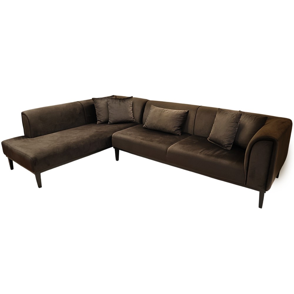 The corner sofa is an elegant choice for those looking for a suitable piece of furniture for their living spaces, offering not only a beautiful look, but also comfort and functionality. Right-handed model, which means that the corner of the sofa is located on the right side when facing. Contains a dark brown textile upholstery. This color can contribute to the creation of a sophisticated and calm atmosphere, it can easily adapt to the home decor.