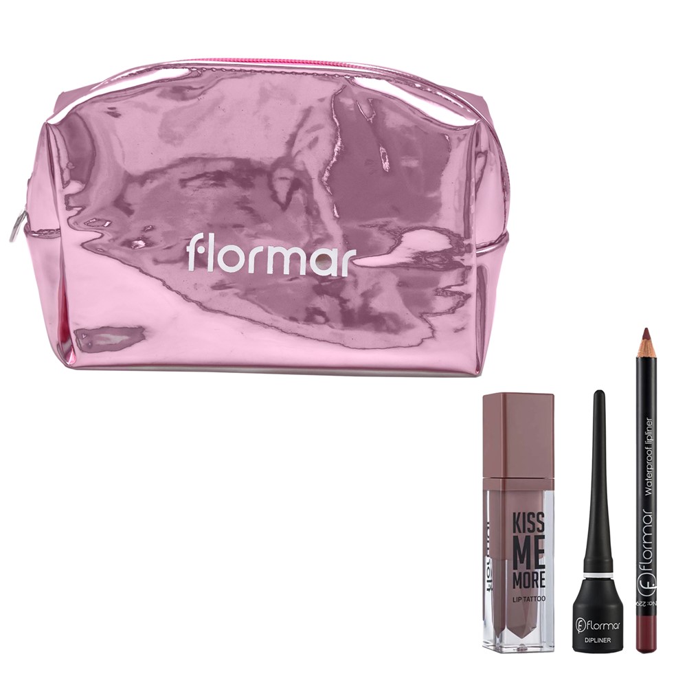 Makeup set for women, which includes a bag for holding various cosmetic products (787645), a waterproof lipliner 229 Tender Cream (784707), which is used for lip contouring and color enhancement, a waterproof dipliner (784737), in black color, and a Kiss Me More 03 Skin lipstick (784740), in matte color.