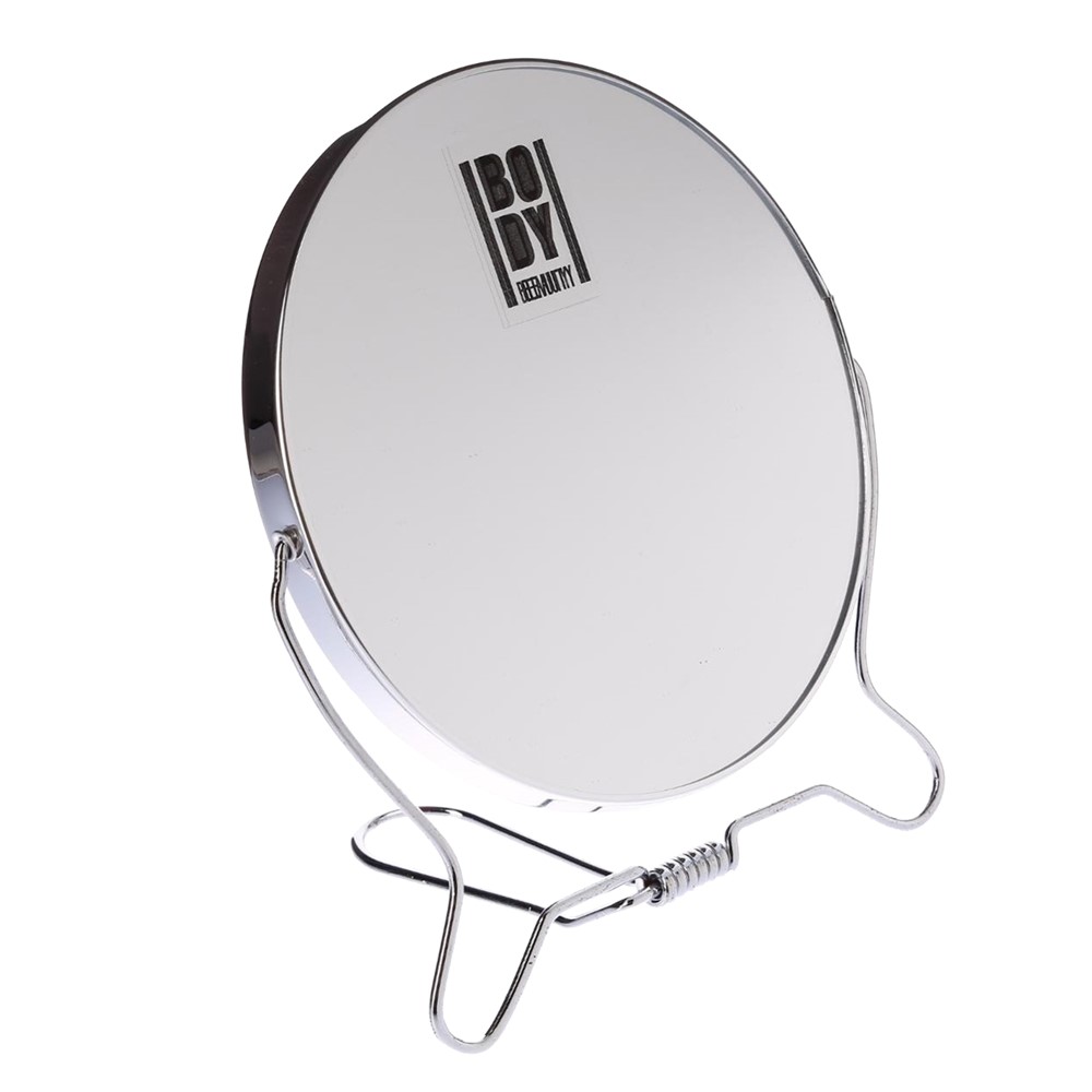 Round-shaped cosmetic mirror, with 2 sides, with a supporting structure made of metal material, with a diameter of 14 cm, in silver color. The mirror rotates up to 360 ° and it has a 3x magnifying effect on one side, allowing for a better view of the face during use. It is used when applying makeup or other face care products, for better results. The support made of metallic material makes it suitable to be placed on the surfaces of tables or bedside tables, in bedrooms or bathrooms.