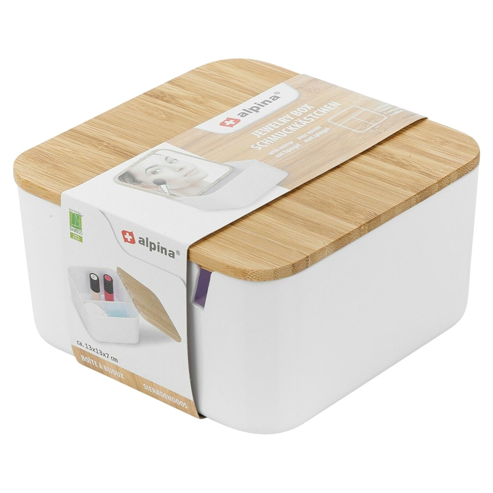 Cosmetic box, organizer, 12.9x6.7 cm made of plastic and bamboo material. It serves for the clean storage of cosmetic accessories or jewelry. Box equipped with a lid and a mirror. The organizer has 3 compartments.
