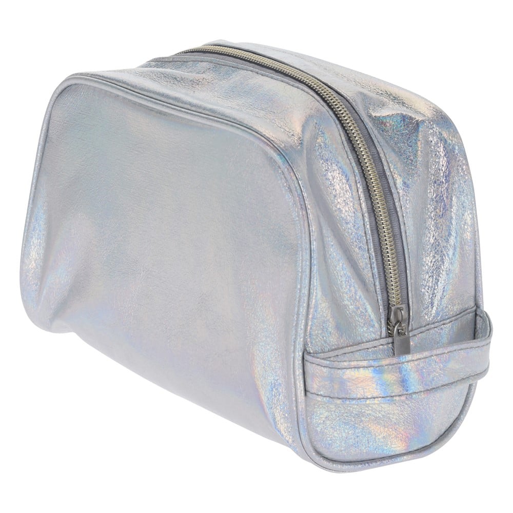 Makeup pouch bag, made of polyester and polyurethane material, in luminous silver color. It can be used for storing and carrying various cosmetic products, such as creams, shampoos, makeup products, perfumes, various lotions or other accessories. It has small dimensions, which make it suitable to take with you on trips.