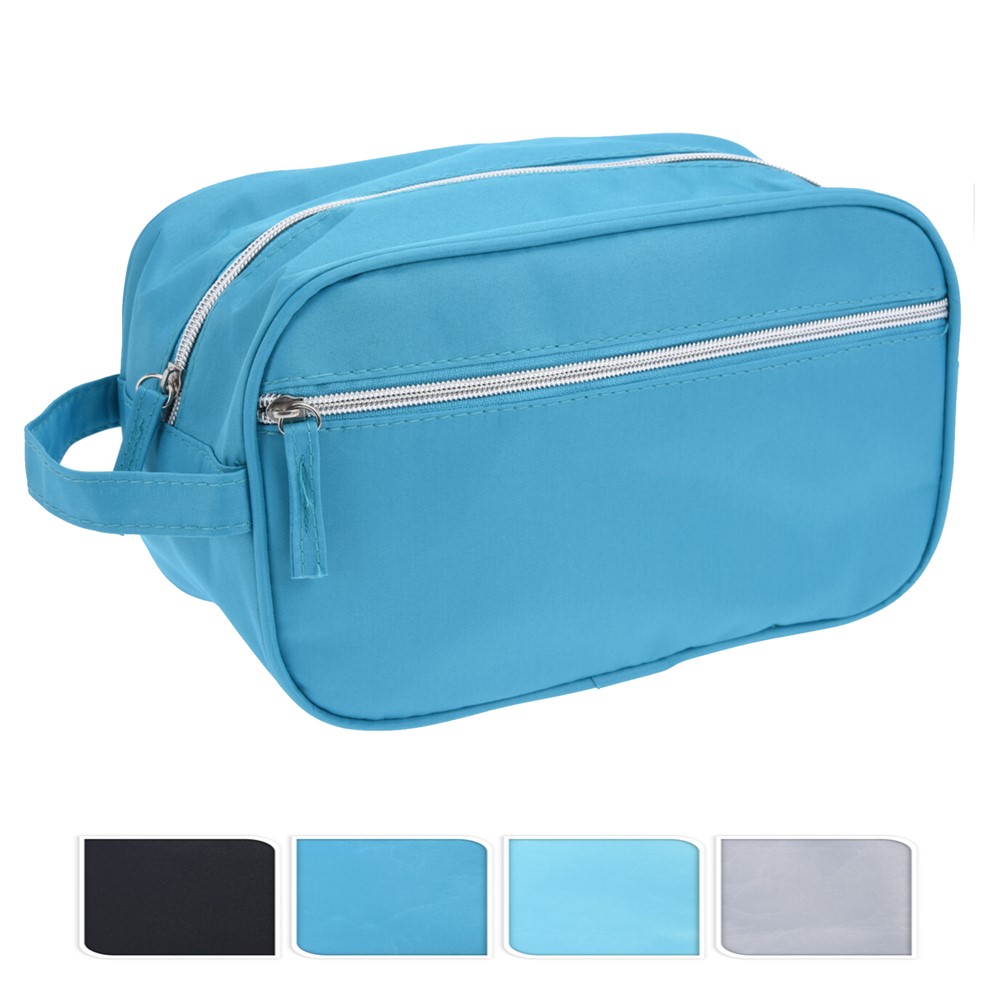 Cosmetics storage bag with side handle, made of polyester material, in different colors, which is eqquiped with a large compartment with zipper and with a small pocket on the outside. It is used for storing and carrying various cosmetic products and personal hygiene products, such as creams, shampoos, makeup products, perfumes, various lotions or other accessories, as well as for organizing them in travel bags. This product is lightweight and has compact dimensions, which make it convenient to take with you on trips.