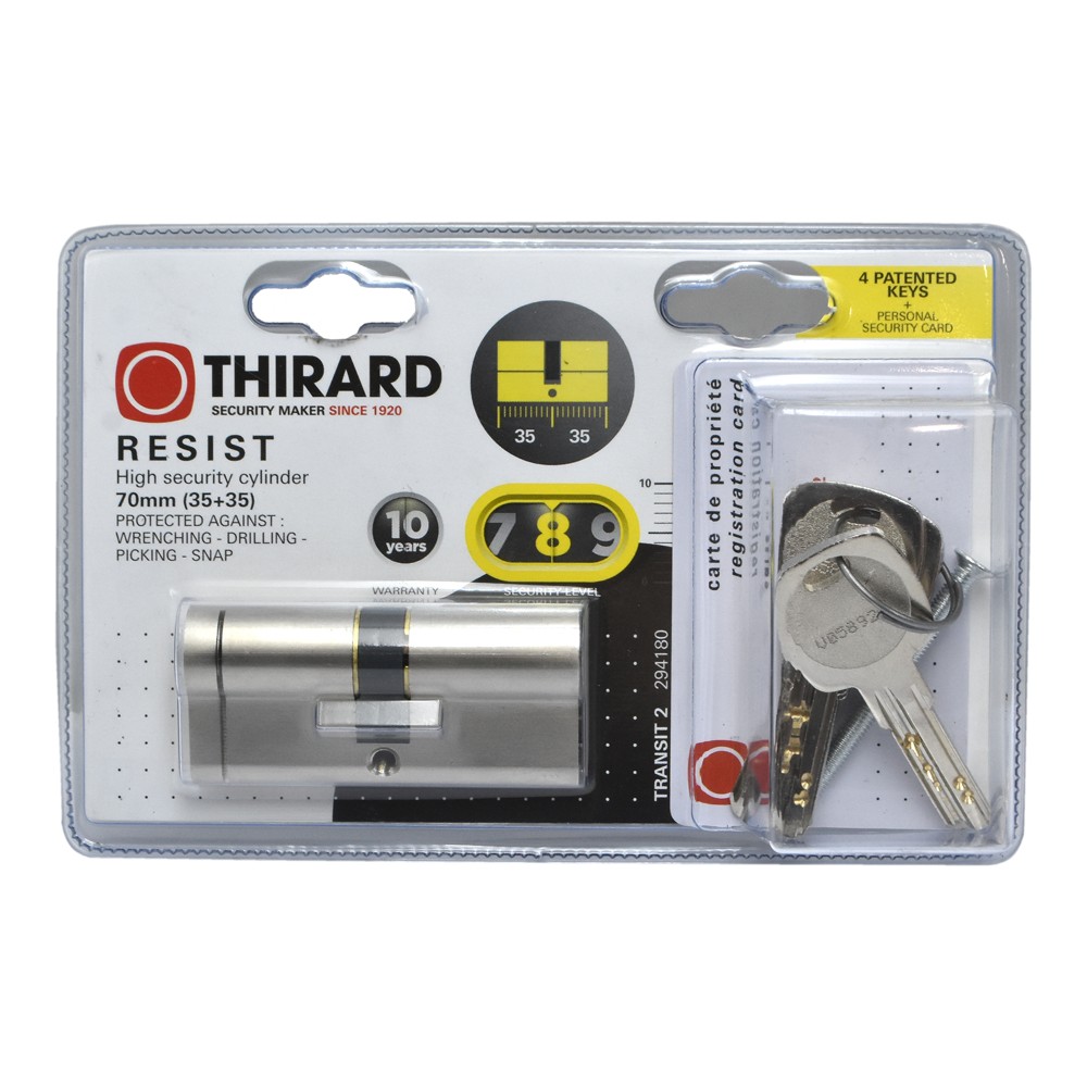 Cilinder 35x35 mm, me mekanizëm prej 8 kunjash për mbrojtje kundër shpimit. Me kunja çeliku të ngurtësuar dhe ka 5 çelësa, një kartë sigurie personale për kopjet e çelësave.