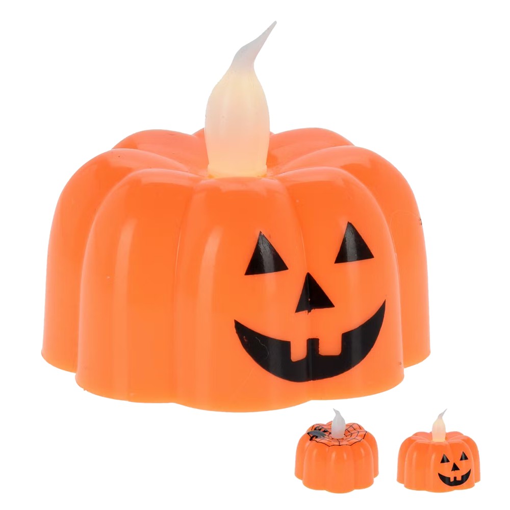 Pumpkin-shaped decorative candles, made of plastic material, for Halloween decorations. It has a size of 4 cm, in orange color. It works with a battery. The package contains 1 piece.