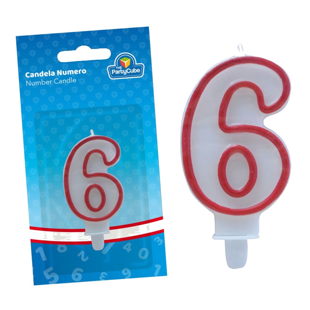 Decorative candle for parties, in the shape of the number 6, with dimensions of 6.5 cm. It is used to be placed on cakes, during birthday parties or various anniversaries.