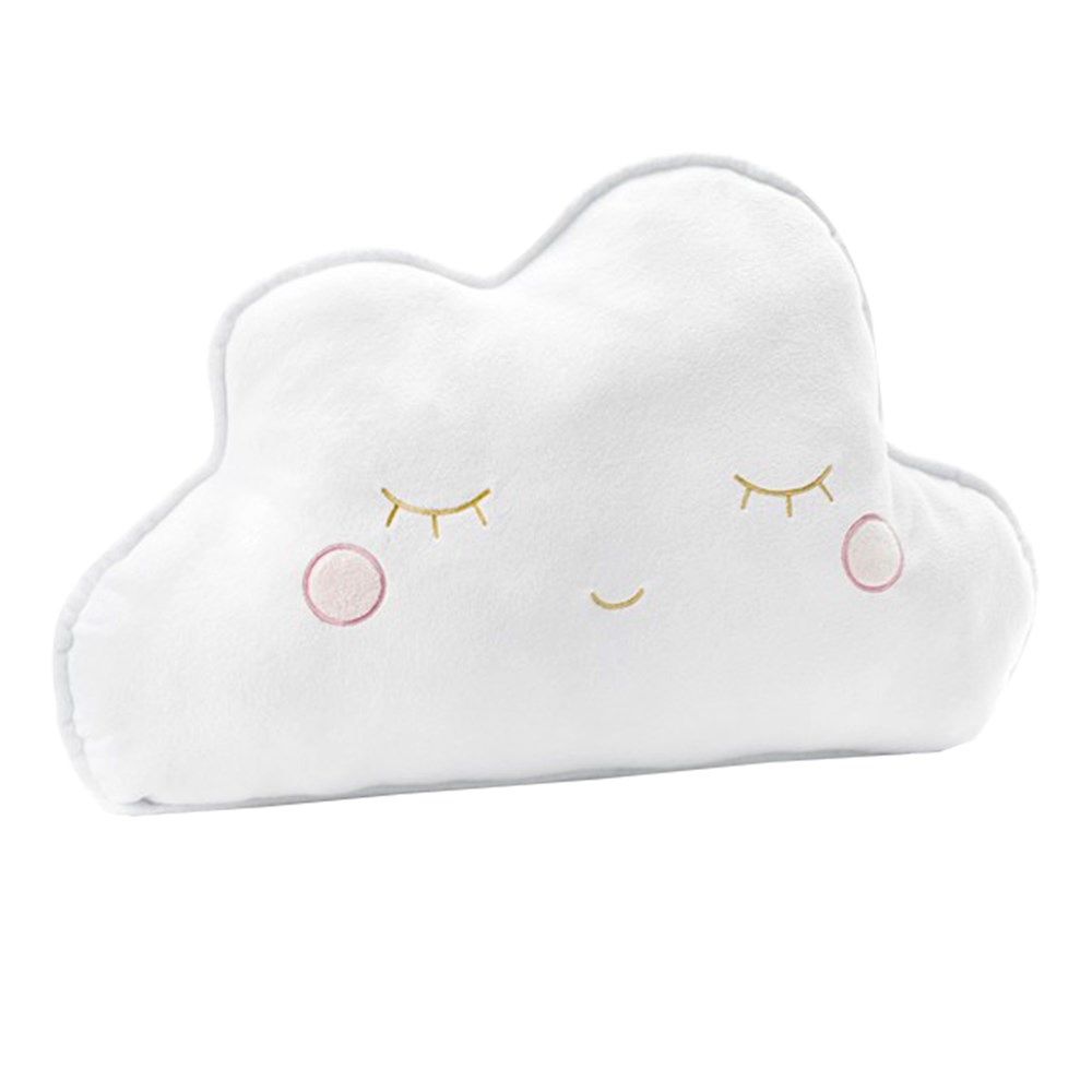 Decorative pillow for children's room with cloud decor, made of soft cream-colored plush material with details embroidered with filter filling on the inside. dimensions approximately 54 x 31 cm.