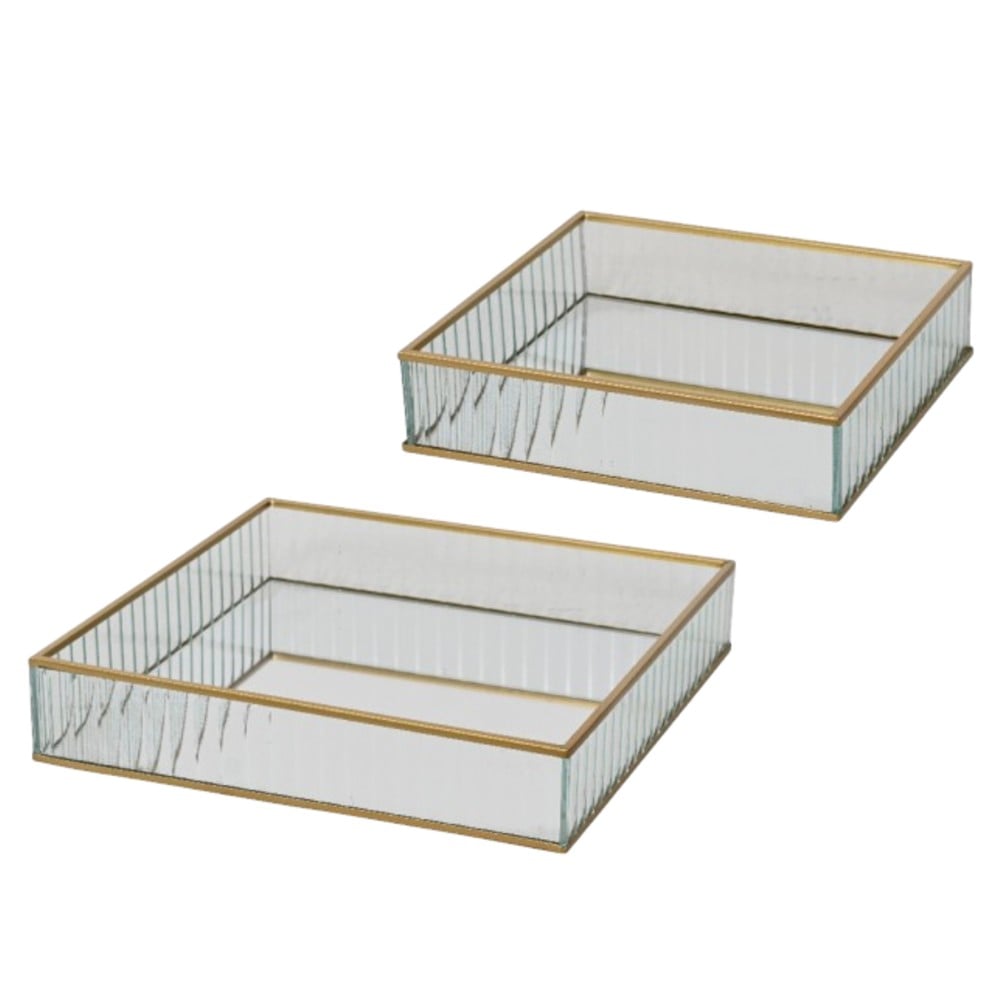Set of 2 decorative metal and glass trays, in gold color, that offers an elegant and luxurious style. Use this set as an accessory for tables, shelves or as a detail that attracts attention and creates a modern and refined atmosphere in your home.