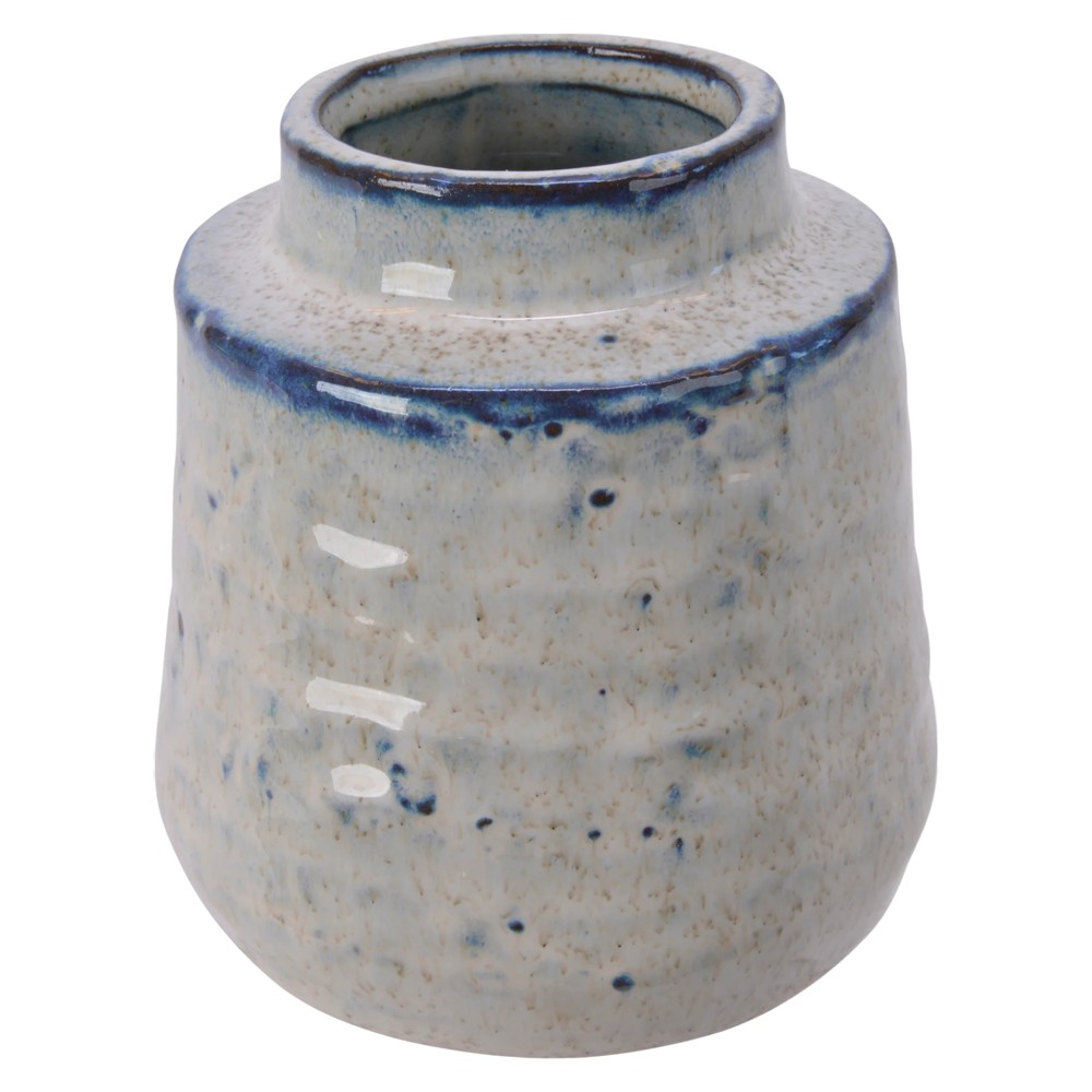 Decorative glass vase in shades of white and blue, with a diameter of 10.5 cm and a height of 11 cm. This beautiful and compact accessory brings freshness and tranquility to any environment, thanks to the combination of soft and harmonious colors. Its elegant shape and convenient dimensions make it ideal for placing on shelves, tables or windowsills, where it can hold small flowers or decorative branches. The white and blue colors create a relaxing and fresh atmosphere, bringing a natural and attractive touch to your space.