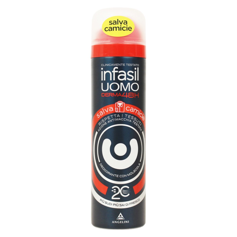 Deodorant specially designed to protect men's clothing: the anti-stain formula of Infasil Uomo Derma48H Salvacamicie has been tested on the most commonly used fibers such as cotton, shirts and T-shirts. Uncompromising protection up to 48H thanks to the exceptional technology with MOLECULA 2C, Betacyclodextrin. Tested on sensitive skin.