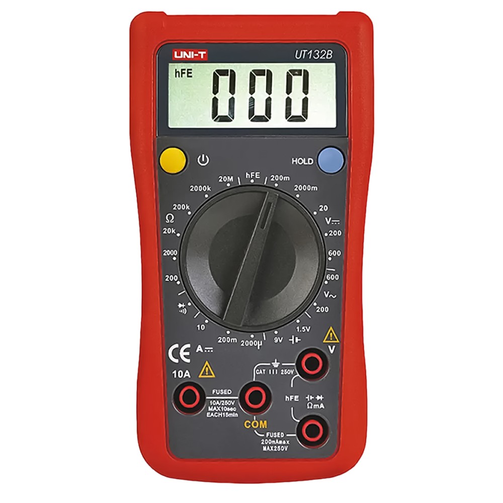 UNI-T's UT132C is a 2000-count handheld digital multimeter that measures AC/DC voltage with an accuracy of ±(0.5%+2), DC current and more. DC Voltage (V) EU: 200mV/ 2000mV/ 20V/ 200V/ 600V ±(0.5%+2) AC Voltage (V) EU: 200V/600V ±(1.2%+3) DC Current (A) 2000μA/ 20mA/ 200mA/10A ±(1%+2) Resistance (Ω) 200Ω/ 2000Ω/ 20kΩ/ 200kΩ/ 2000kΩ/ 20MΩ ±(1.2%+3) Temperatures (°C) -40°C ~ 1000°C ±(1.0%+3)