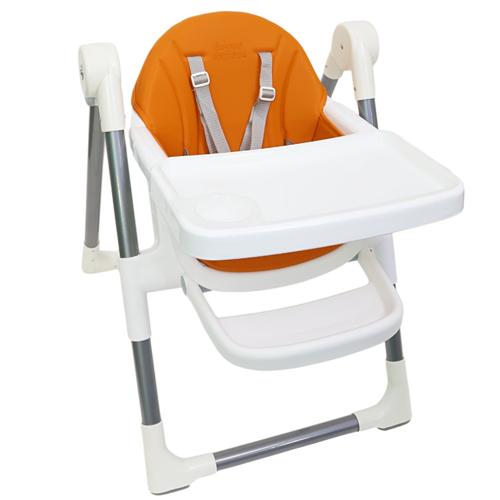 The baby feeding chair, made of aluminum and plastic in orange and white colors, is suitable for children over 6 months. Lightweight and durable, it offers comfort and safety while eating. The modern design facilitates cleaning and storage, making it an ideal choice.