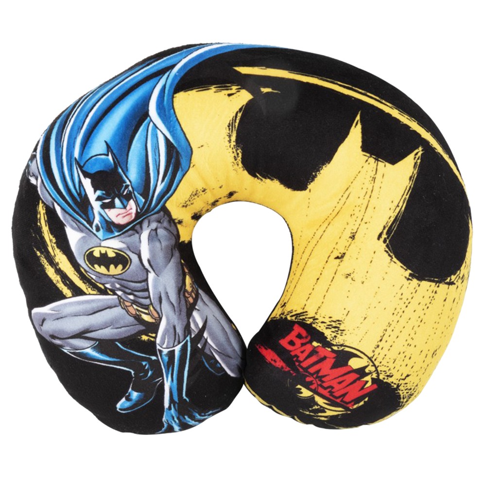 Travel pillow with Batman design, U-shaped, made of cotton, synthetic polyester and elastane material, with Batman design, and filled with soft polyurethane material, with antibacterial and hypoallergenic properties. It is used to support the head or to sleep during a car or plane trip, without damaging the vertebrae of the neck. It has compact dimensions, which make it practical to take with you on trips. The component material is gentle on the skin and does not cause irritation.