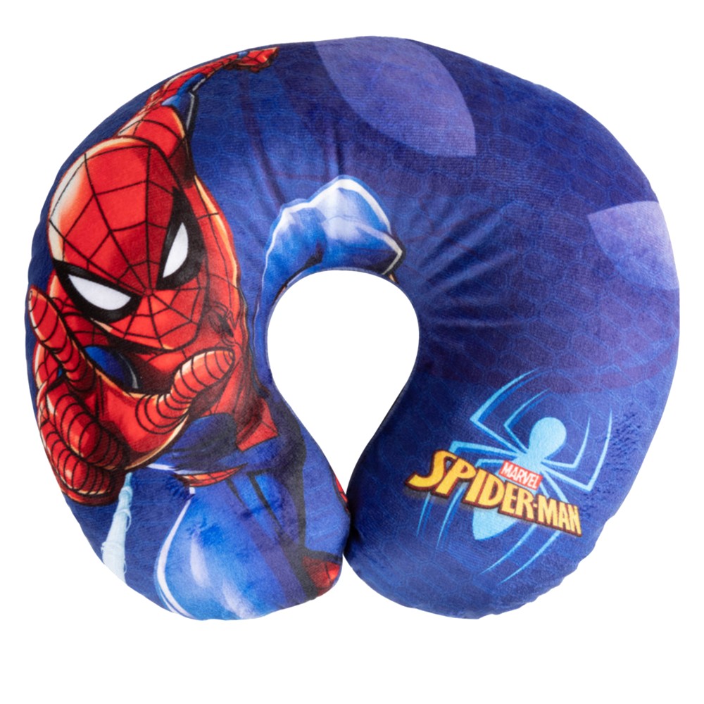 Travel pillow with Spiderman design, U-shaped, made of cotton, synthetic polyester and elastane material, with Spiderman design, and filled with soft polyurethane material, with antibacterial and hypoallergenic properties. It is used to support the head or to sleep during a car or plane trip, without damaging the vertebrae of the neck. It has compact dimensions, which make it practical to take with you on trips. The component material is gentle on the skin and does not cause irritation.