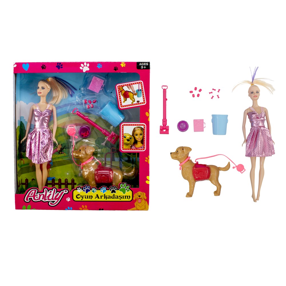 Toy set for girls, which includes a doll, a puppy and other accessories. This set helps to develop the imagination, stimulates the development of the sensory skills and the development of learning skills in children, through role play. The constituent material and paint have no content that can be toxic or harmful for children and the product is certified for safety in use. This product is suitable for use by children over 3 years old.