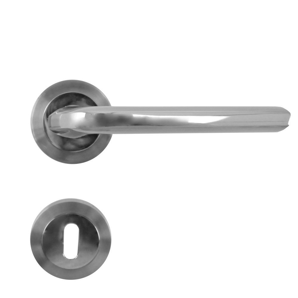 This door handle with chrome color.It is a qualitative and resistant handle, her body is composed of solid zinc material, including accessories for instalation.