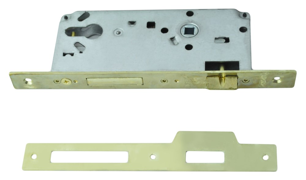 Door locks with 50x85mm size, used for interior wood doors. Technical features: • Zinc painted steel case and cover • Brass plated removable faceplate and striker • Reversible brass conical latch • Double-throw steel dead-bolt single-throw dead-bolt for bathroom doors. • Roller can be adjusted from 2 to 13 mm.