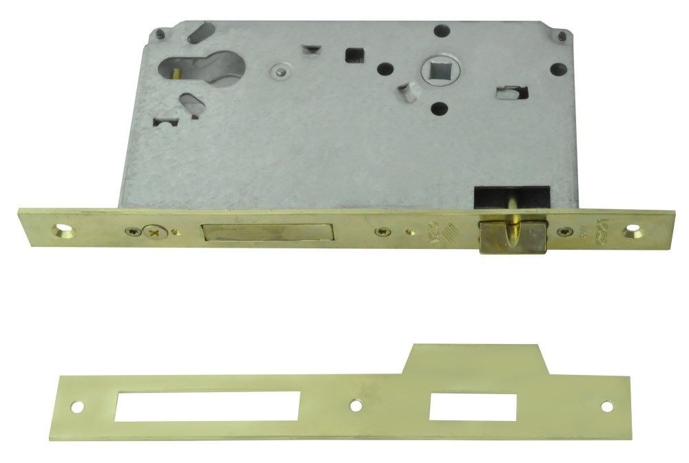 Door locks with 50x85mm size, used for interior wood doors. Technical features: • Zinc painted steel case and cover • Brass plated removable faceplate and striker • Reversible brass conical latch • Double-throw steel dead-bolt single-throw dead-bolt for bathroom doors. • Roller can be adjusted from 2 to 13 mm.