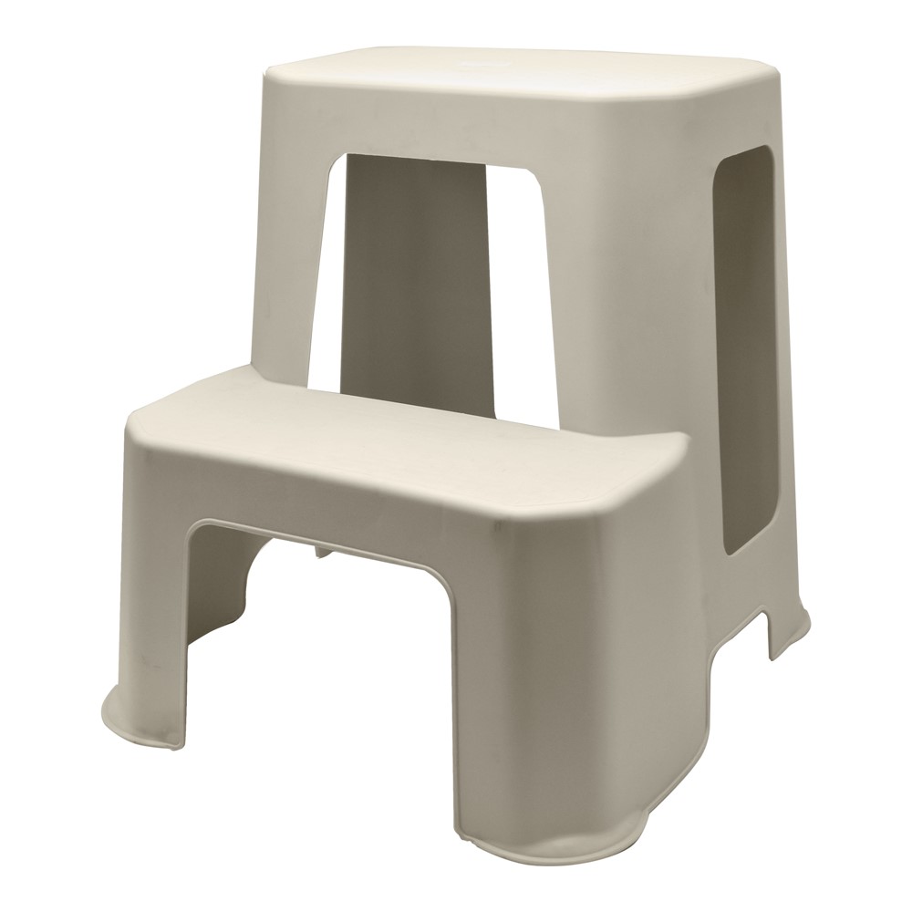 Double-step stool for children, made of plastic material, in beige color, equipped with bordered support legs, to protect against slipping. It is used to help teach young children to use the adults' toilet, as well as to easily reach the sink for washing hands or for brushing teeth. This product is suitable for use by children over 2 years old.