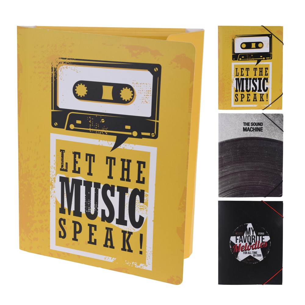 Folder file, made of durable cardboard material and equipped with elastic bands, with dimensions of 32x23.2 cm for sheets of A4 format, with Tape Records design and in different colors. It is used to place and store various documents, daily task papers or creative works. This product is suitable for use in schools, universities, courses, stationery offices, etc.