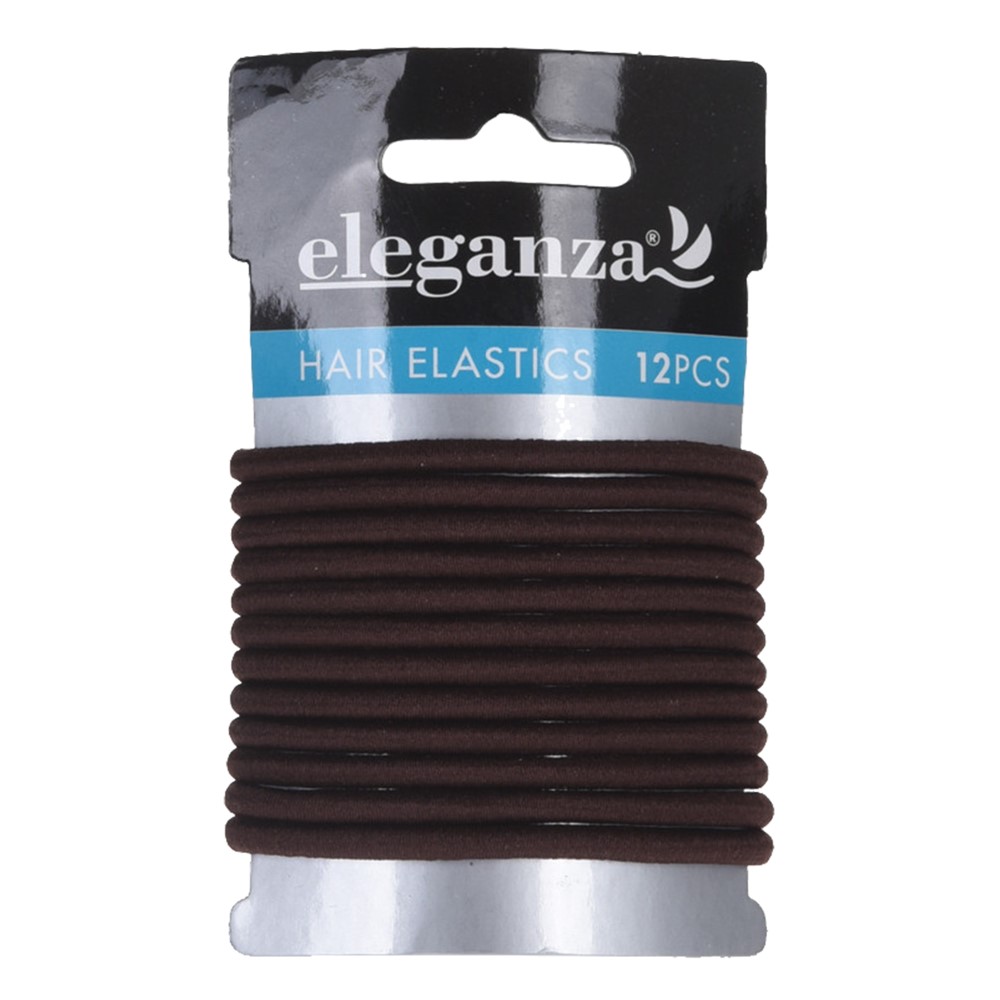 Elastic hair band, made of polyester and elastane material, with dimensions of 5.5 cm in diameter, in brown color. It can be used for fixing and styling the hair in different hairstyles, it has an constituent material which does not cause friction or breakage of hair strands, it is water resistant and it can be used by all ages and genders. This product is suitable for professional and non-professional use. The package contains 12 pieces.