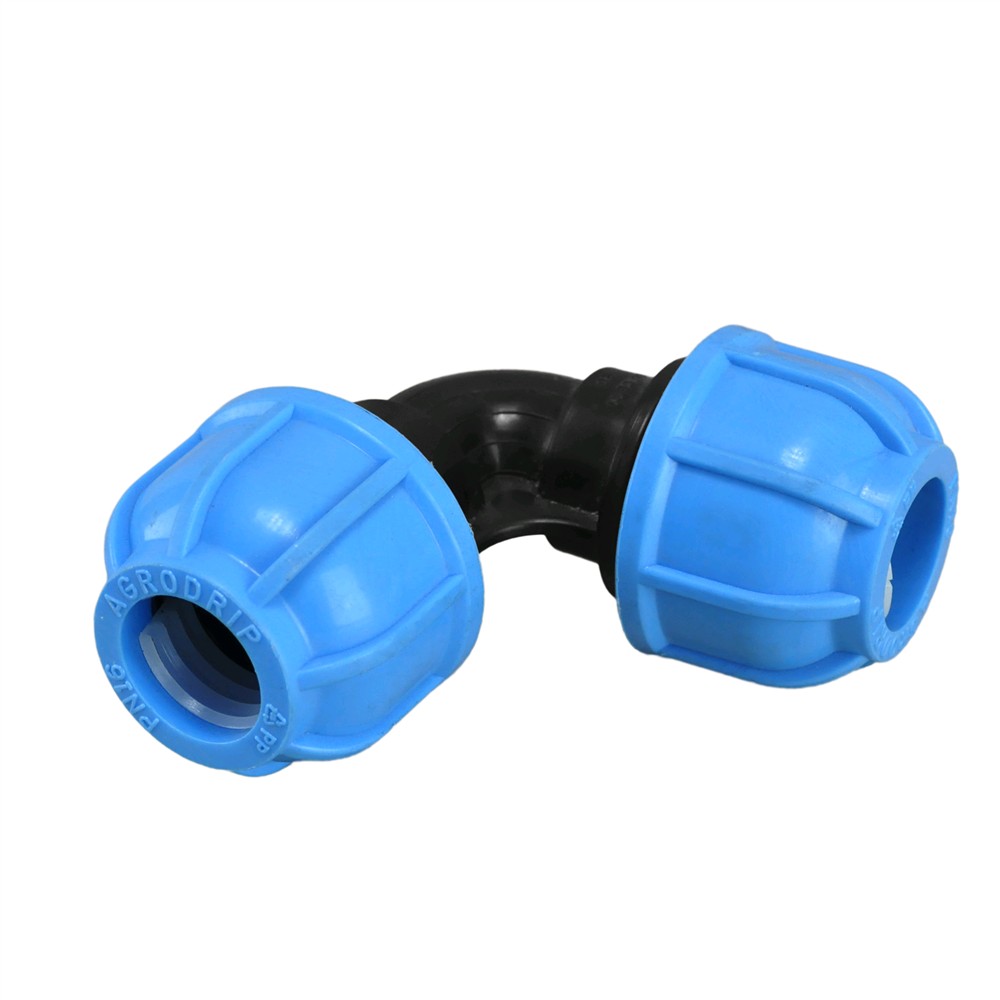Elbow with faucet of PP 20x20mm with angle 90° used to installations angular water supply infrastructure lines, in irrigation and agricul, etc. The elbow enables network returns 90° angle. Elbow network connects two pipes through coercive mechanical faucet. Manufactured with European standards, resistant to corrosive materials designed to withstand pressure up to 16bar.