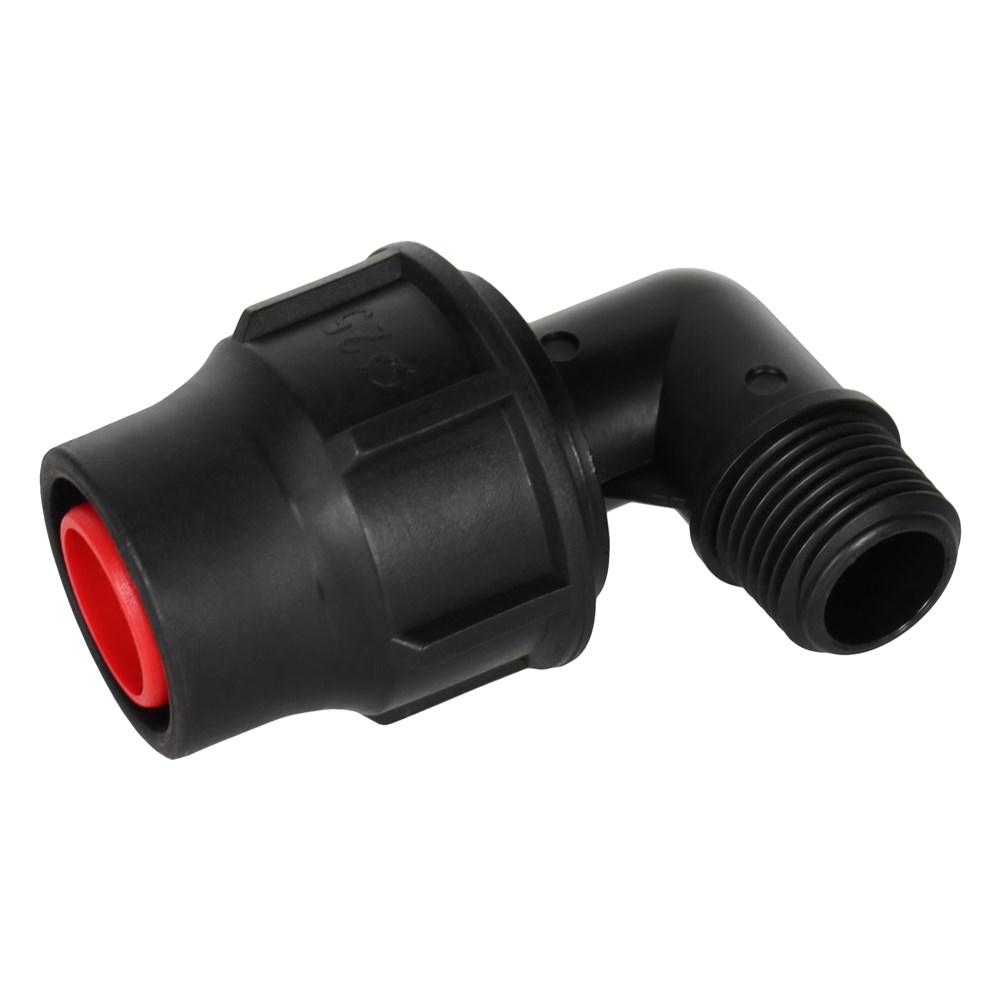 Elbow with faucet of PE 25x1/2" male with angle 90°. Used to installations angular water supply infrastructure lines, in irrigation and agricul, etc. This elbow enables network branching 90° angle. This elbow connect LDPE pipe Ø 25 with other fittings by fillet, for joining the fillet recommend tu use teflon whiles pipe connect whith elbow in mechanically with faucet. Manufactured with European standards, resistant to corrosive materials designed to withstand pressure up to 6 Bar.