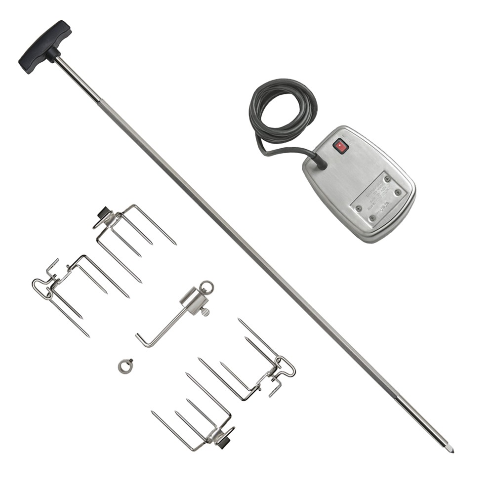 Electric barbecue skewer set which contains a 230v electric motor, a skewer rod, 4 forks with 4 skewers, a fixing ring and a counterweight. It is very practical to make the best use of your roasting meat. The skewer is stainless steel which makes it easy to rotate it for a more even roasting. Suitable for barbecue models Prestige 665 ( code 7807600 ) & Prestige PRO 665.