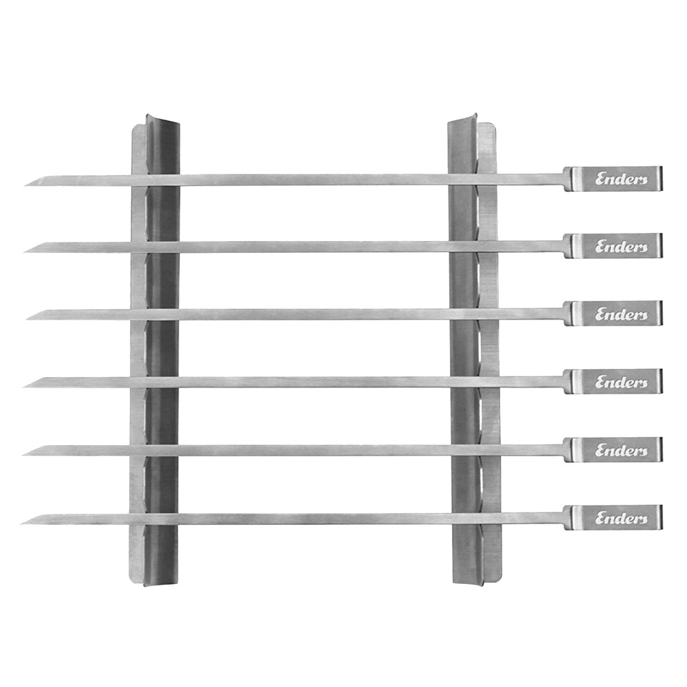 Set of barbecue skewers, Enders, 38 cm, made of stainless steel material, with six flat skewers and a two-piece frame. The practical stainless steel frame prevents the skewers from lying directly on the grill grate, which means that the food remains very juicy and does not dry out. This type of preparation is particularly suitable for vegetable skewers, as they burn very quickly and form bitter inedible substances. Also practical, the two parts of the frame can be placed individually and placed to save space.