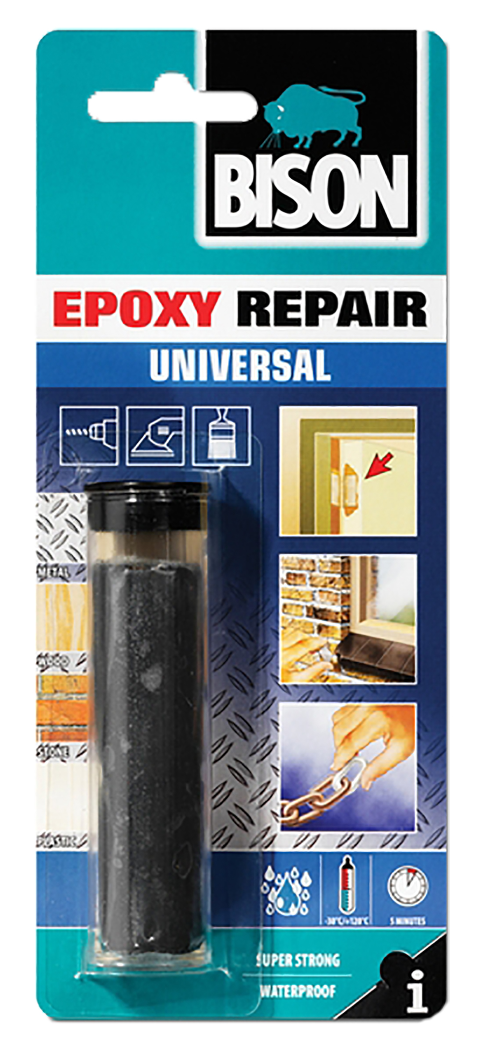 Metal coloured, adhesive universal epoxy Ideal for repairs to metal objects which need to resist extreme conditions (forces, vibrations, (sea) water, heavy strains). Also suitable for filling small holes in radiators. Bonds metal (steel, aluminium, iron), stone, wood, concrete and various synthetics. Not suitable for Polyethylene (PE), Polypropylene (PP), P.T.F.E. and silicone rubber. Temperature resistant from -40°C to +60°C. Apply only at temperatures between 5°C and 35°C. Surface should be free of dust and grease