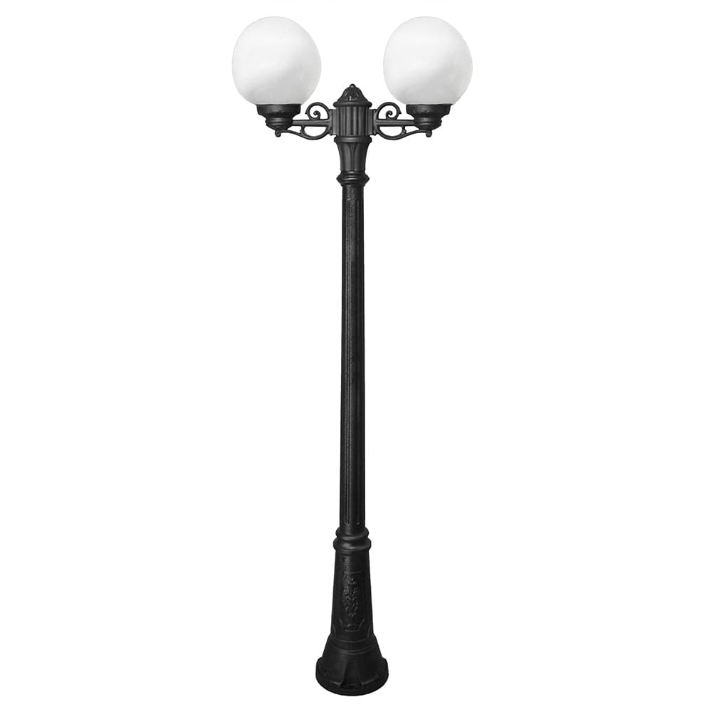 Exterior globe post light, Fumagalli, black, white globe, 2 x E27, H205 cm, D25 cm. Add beauty, elegance and functionality to your outdoor spaces, for more pleasant evening with friends and family in your gardens or terraces lighting is an unsubstituted element and an excellent choice would be the resine radiant with a fin design and stylish.