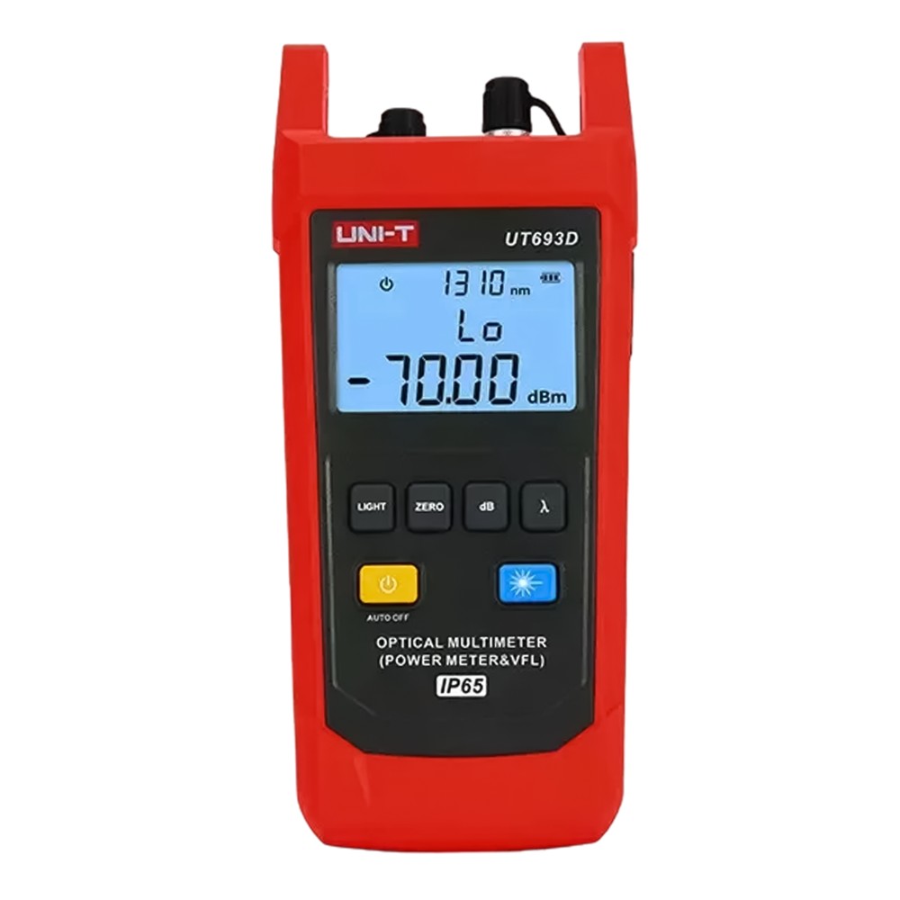 UT693D Fiber Optic Power Meter (power meter and VFL) ● Cable construction and maintenance ● Fiber optic communication ● Evaluation of optical equipment ● Production, installation, operation and maintenance of fiber optic transmission systems ● Optical engineering, manufacturing facilities or facility maintenance Optical power meter Wavelength range 800nm~1700nm Calibrated wavelength 850nm, 980nm, 1300nm, 1310nm, 1490nm, 1550nm, 1625nm, 1650nm Measurement range UT692D/UT693D: -70~10dBm, UT692G: -50~26dBm Uncertainty ±5% Display resolution Linear: 0.1%, logarithmic: 0.01dBm Connector HR/SC/ST Detector type InGaAs Visual fault locator Wavelength 650nm±10nm Power 10mW (measurable optical fiber length: approximately 8~10km) Modes Continuous/Pulse Connector HR/SC/ST