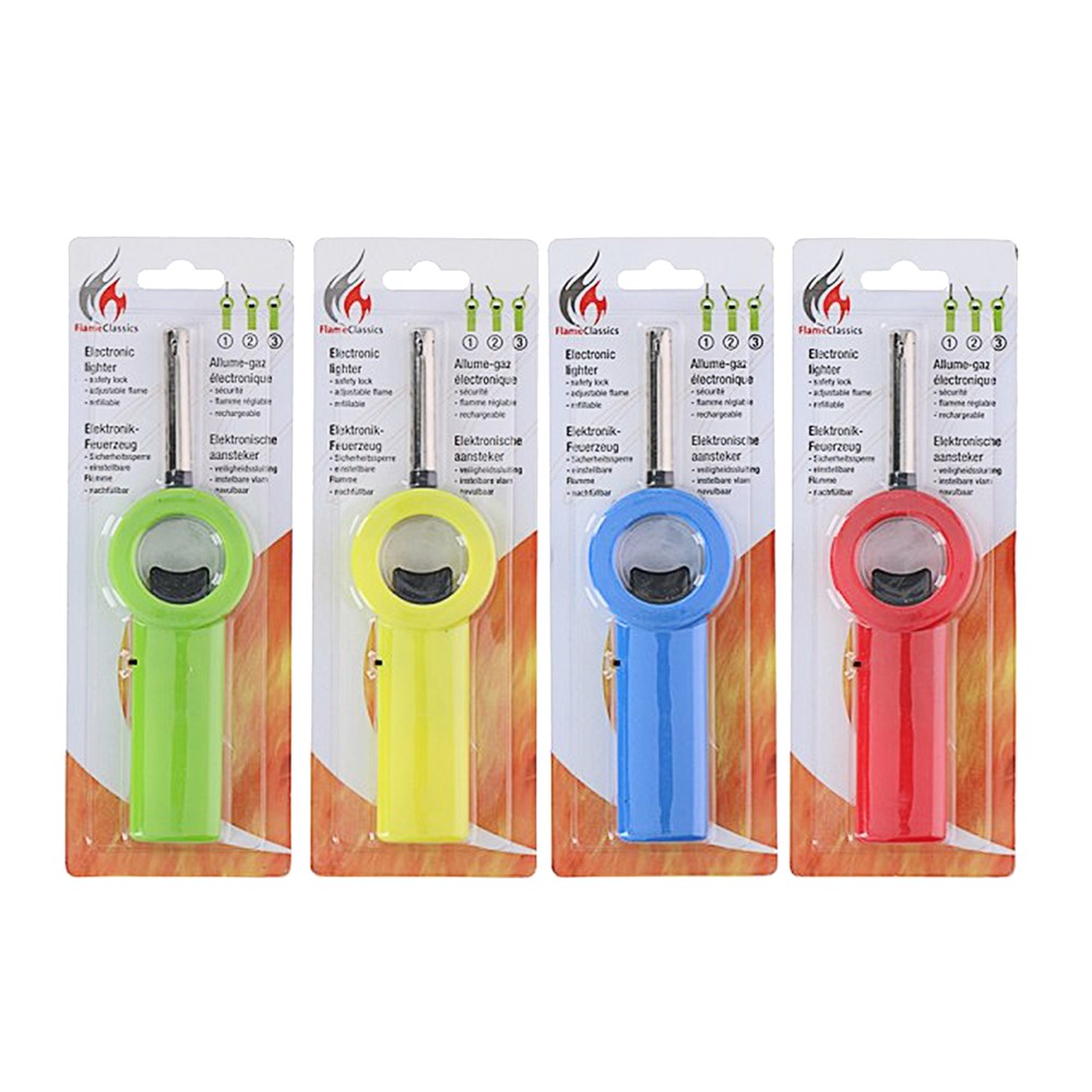 Gas fire lighter, made of plastic and metal material, with adjustable flame, with dimensions of 18x4.9x1.7 cm, in different colors. It can be used to easily light a fire in fireplaces, in grills, barbecues, in camping or picnics, to light the cooking plates that work with gas or to light the candles. This product is lightweight and practical to use and it can be refilled.