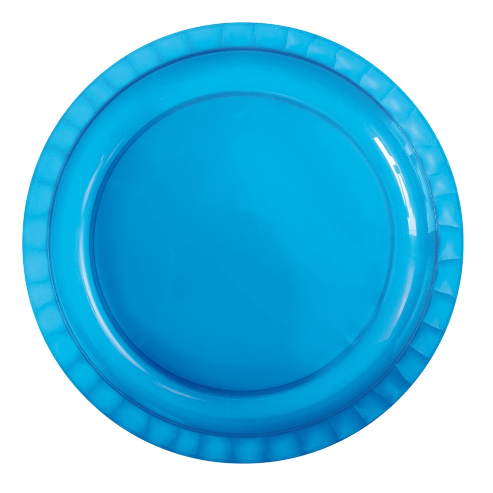 Flat plate, made of heavy duty plastic material, certified for food safety, with a diameter of 25.5 cm and a depth of 2.5 cm. It can be used on picnics, camping trips, parties or to-go lunches. The constituent material is durable and long-lasting and it can be easily cleaned.