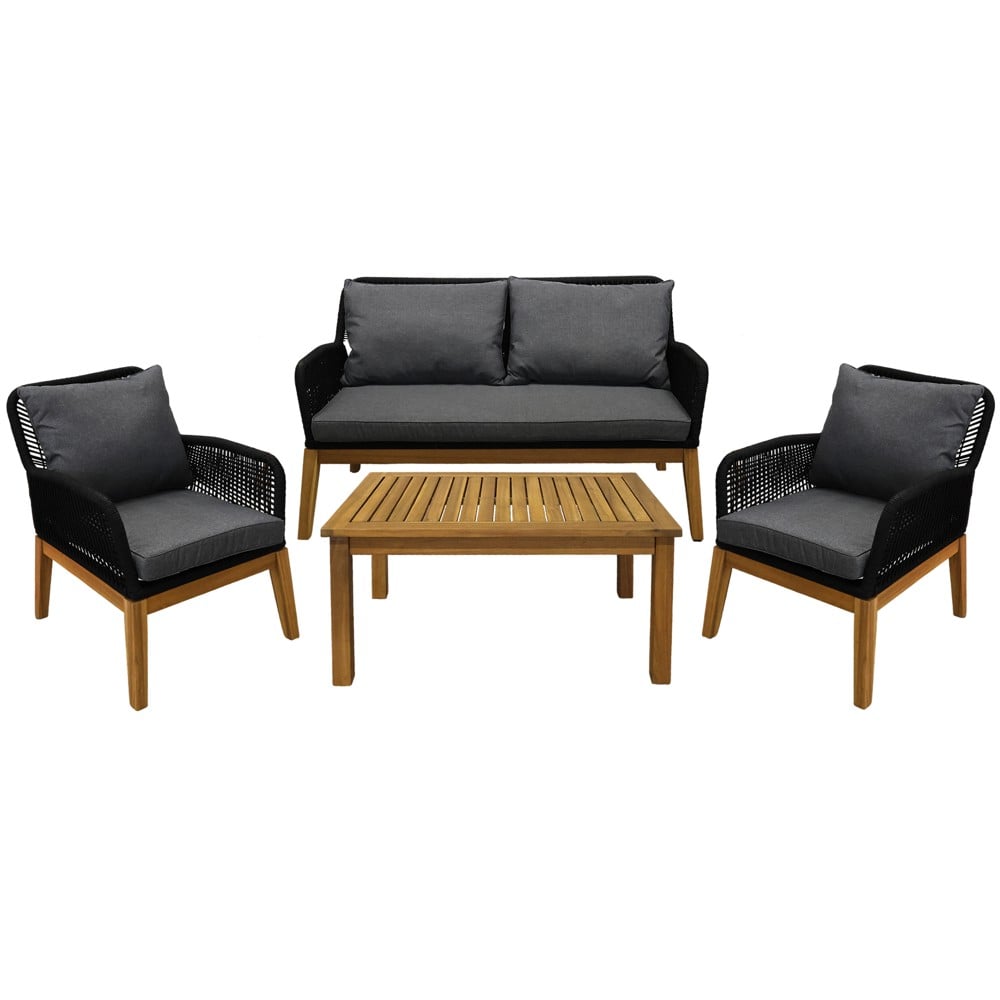The Florida set contains 2 single armchairs, 1 double armchair and 1 table, offering an attractive and comfortable setting for outdoor furniture. This furniture is composed of a combination of metal frame and acacia wood, given a modern and elegant look.