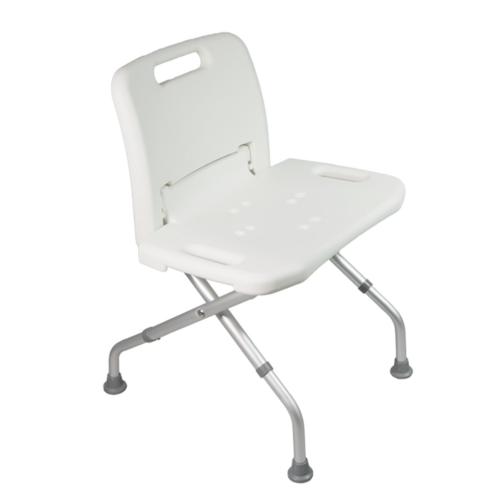 Foldable stool for bath and shower, with a supporting structure made of aluminum material and with a seat and backrest made of polypropylene material, with dimensions of 45x31x68.5 cm, in white color. The stool has support legs with adjustable length, equipped with rubber fittings at the bottom, to prevent slipping on wet and smooth surfaces. This product is suitable for use by people with disabilities and the elderly, to facilitate bathing in the bathtub or shower.
