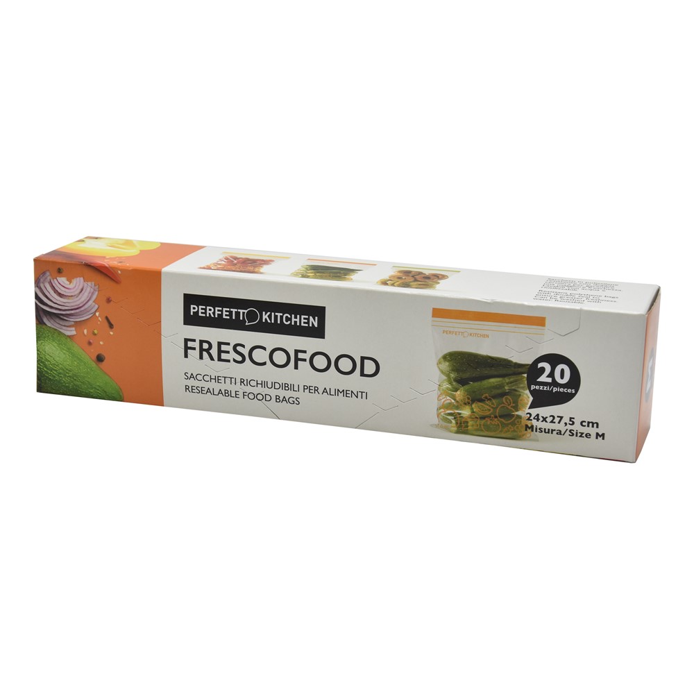 Food storage bag, size M, made of plastic material, with dimensions of 24x27.5 cm, in transparent color. The bag is equipped with an airtight self-seal closure and the constituent material has hygienic and antibacterial properties. It is used for storing various foods in the refrigerator, while preserving the properties and taste of food and preventing the creation of unpleasant odors. This product is suitable for use in home environments or for storing various ingredients in professional kitchens.