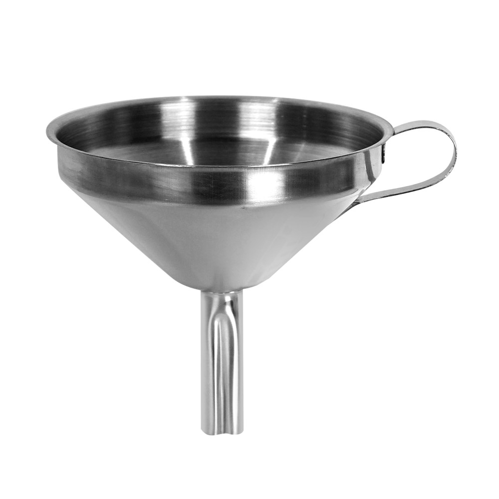 Pouring fluid in containers with narrow gorge is now easily possible through metallic funnel. Inverted cone diameter 12 cm height of its ends with elongated element for filling bottles with narrow gorge. Practical use and it is modeled with space to allow