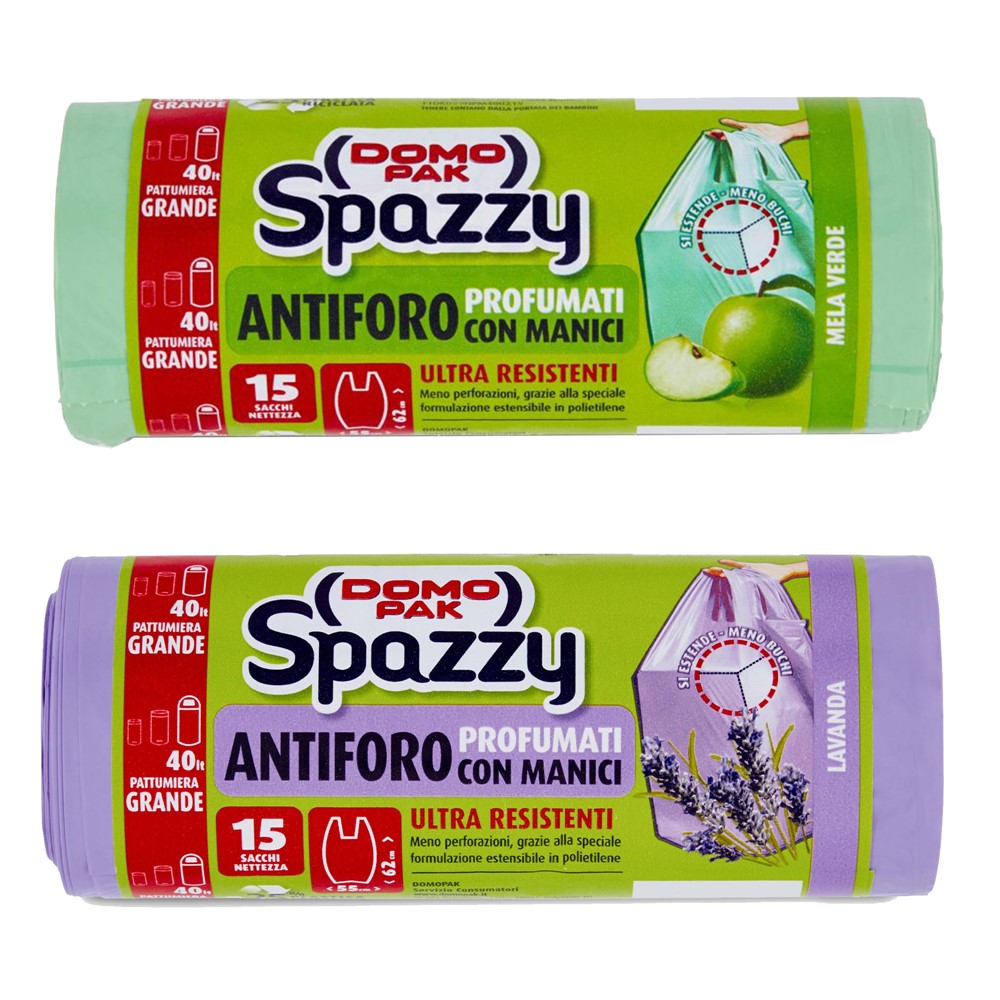Thanks to the special expandable formulation in polyethylene, it is ULTRA RESISTANT and less prone to cracks and splits. Easy to close and carry thanks to the practical incorporated handles. You can choose the scent you like best choosing from lavender, green apple, alpine breeze and orange. Domopak Spazzy Antiforo Profumato is also ecological. Reduces environmental impact because it is produced with 25% post-consumer recycled plastic and is in turn recyclable