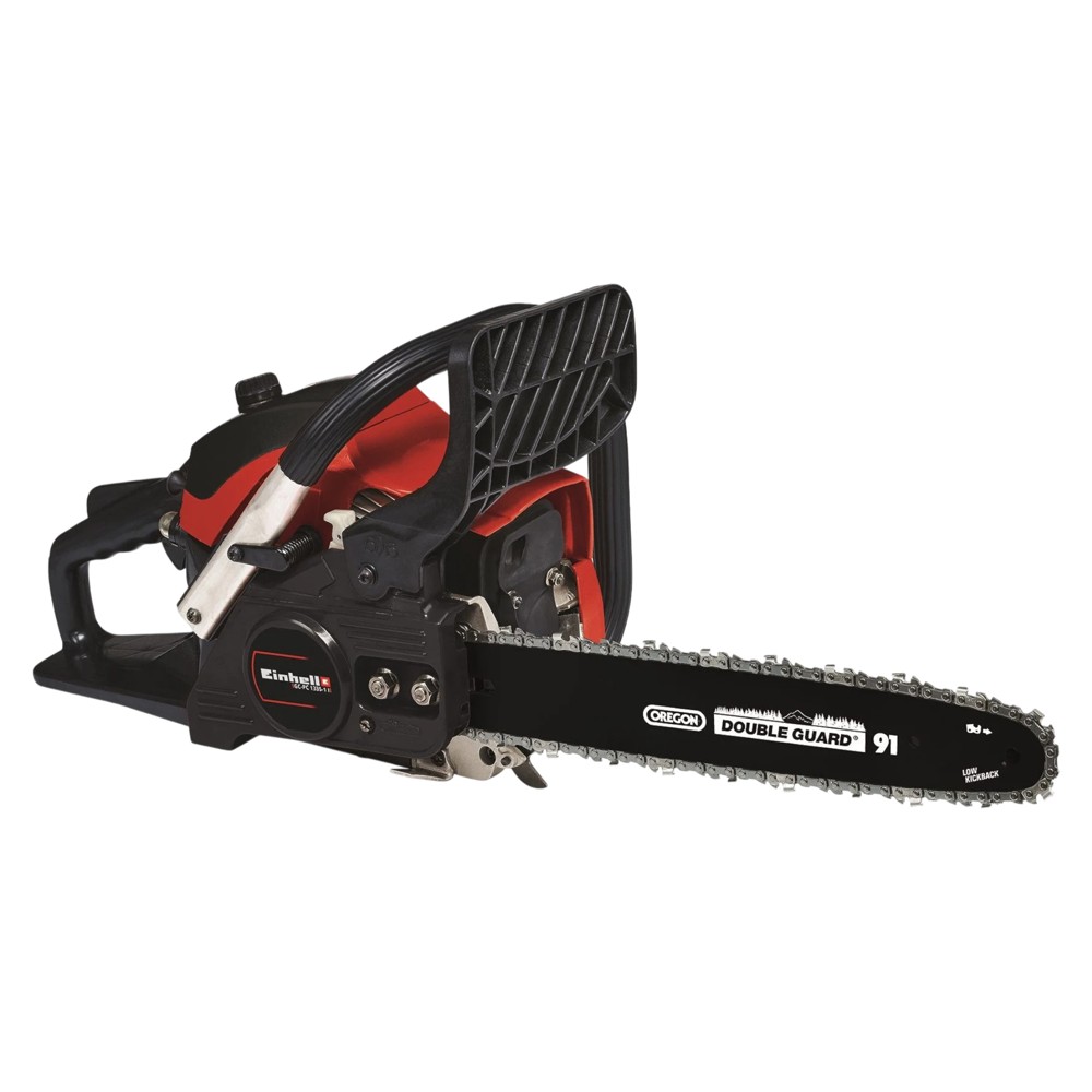 The GC-PC 1335/1 I petrol chainsaw from Einhell combines the high performance of an Einhell petrol chainsaw with the sharpness of an OREGON quality product. Equipped with an ORGEON cutter rail and chain, it is ready to tackle your home and garden assignments. From branches to construction timber and firewood, there is hardly anything that the petrol chainsaw can't cut down to size. The air-cooled 2-stroke engine with ball bearings at both ends of the crankshaft delivers plenty of power. Thanks to a number of technical support functions, this petrol chainsaw is also safe and easy to use. The anti-vibration feature reduces body stress and fatigue. The primer and auto choke eliminate cold start problems. Digital ignition ensures fast, dynamic fuel intake and stable operation of the engine. Kickback protection and an instant-reaction chain brake protect you while you are working with the chainsaw. The chain stops right away if kickback occurs. A chain catch is also fitted for even less risk should the chain jump off the cutter rail. A large and rugged stop claw made of metal ensures safe and convenient handling for all types of work. The automatic chain lubrication system supplies the chain with sufficient chain oil. A protective bar cover is provided for safe, easy storage of the chain and guide bar. A petrol/oil mixing bottle is also included.