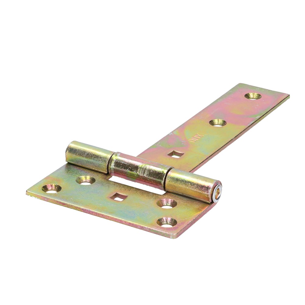 Gate hinge, made of galvanized zinc material, with dimensions of 15x4.5x9x0.3 cm, in golden color. The constituent material is resistant to use, heavy weights, rust or abrasion. It can be used for mounting the outdoor gates of the fences and for other uses.