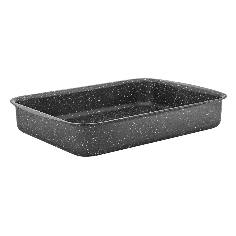Granite casserole with high quality aluminum material with anti-stick coating Germanitium. Ideal for standard ovens from 55L to 76L. The very good quality of the material and the production ensures you convenience and safety in cooking. It is recommended to use accessories that do not damage the Germanitium coating material, such as: wooden spoons, silicone, etc.