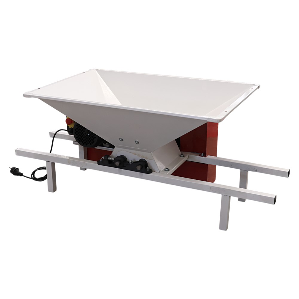 Electric grape pressing machine with separation of the pulp from the grains. It is made of stainless steel material and enamelled.
